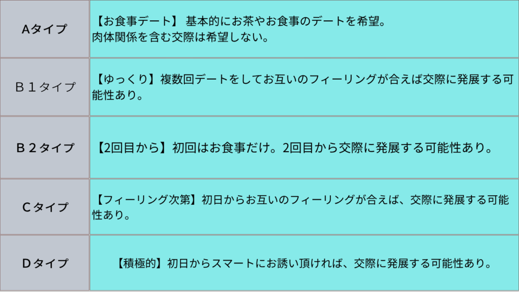 ちなみに男性側から一番オファーが多いタイプはCタイプです。